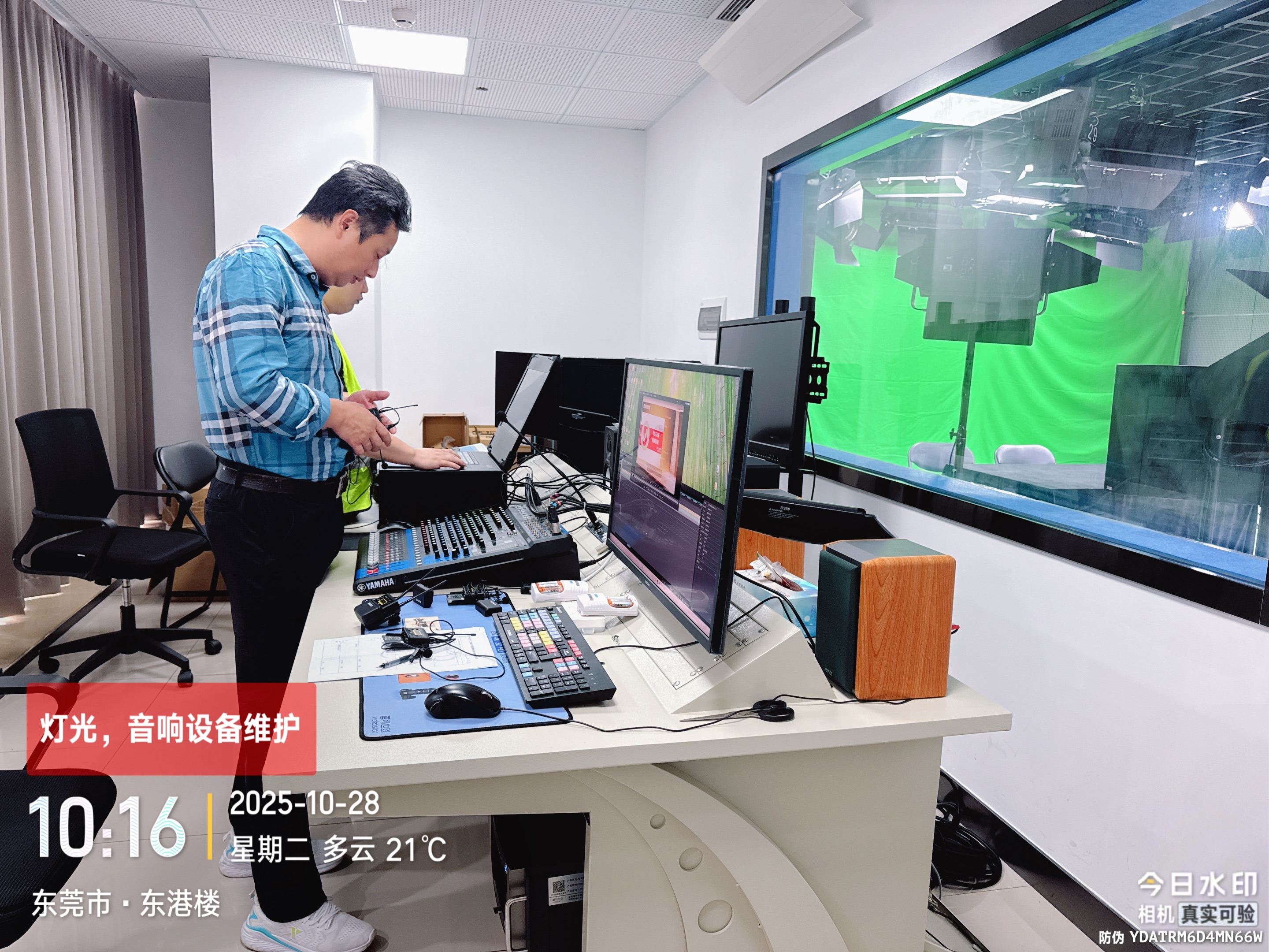 灯光系统维保:包括帕灯、摇头灯、追光灯、LED 大屏等设备的清洁、电路检测、光源更换、程序调试等。从图片中那些色彩斑斓的舞台灯光,到演播厅里的绿幕灯光系统,每一盏灯的亮度、色彩、角度都需要定期校准,才能确保在演出时呈现最佳效果。